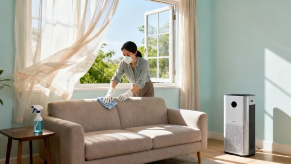 - HEPA Vacuuming: Vacuum every fabric surface, and do it thoroughly. Move slowly and use the upholstery attachment to suck up as many loose particles as you can.